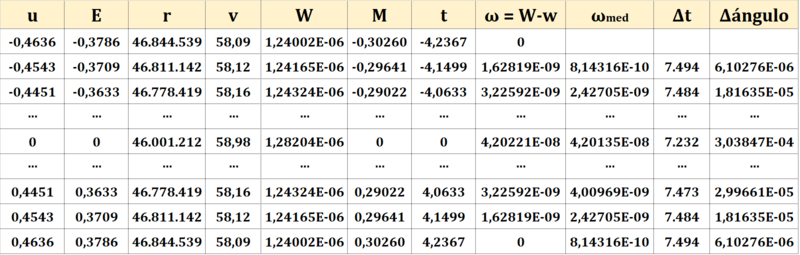 Finalmente queda por calcular el ángulo total aparente que el Sol ha retrocedido en esos 8.47 días. Para calcularlo hemos realizado una sencilla integración numérica: hemos dividido el intervalo desde u=-0.4636 rad hasta u=+0.4636 rad en 100 partes. En cada una de las partes hemos calculado la velocidad angular neta media y la hemos multiplicado por el tiempo de esa parte para calcular el ángulo parcial de retroceso del Sol.