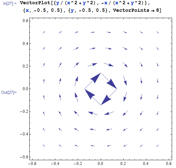 VectorPlot[{y/(x^2 + y^2), -x/(x^2 + y^2)}, {x, -0.5, 0.5}, {y, -0.5, 0.5}, VectorPoints -> 8]