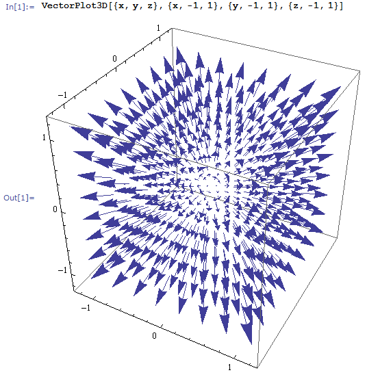 VectorPlot3D[{x, y, z}, {x, -1, 1}, {y, -1, 1}, {z, -1, 1}]