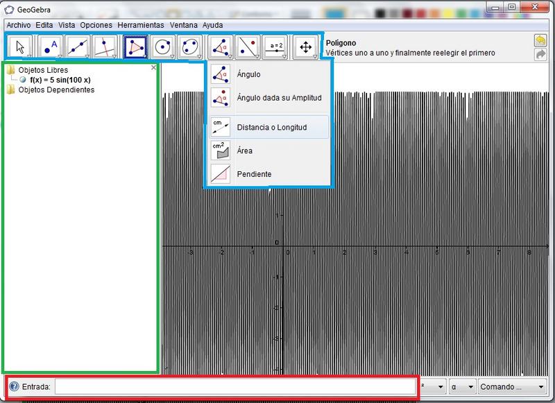 Bueno he aquí geogebra, mi favorito, es software libre, pueden descargarlo desde su pagina oficial, eso sí tiene que tener la maquina virtual de java que tambien es gratutita, este pequeñito programa encierra en su interiro una combinacion de calculo con geometría interactiva y álgebra, en mi caso tiene sólo un defecto, si ustedes por ejemplo grafican la curva , que se hace sólo escribiendo 5*sin(100*x) en el recuadro rojo de la figura donde dice "Entrada", va a mostrar lo siguiente ese poco de líneas negras y se vá a poner tan lento el programa que es posible que no responda y quede colgado, uno tiene que saber hasta que punto uno puede no congestionar una grafica. En el recuadro verde tenemos la ventana de objetos, cada grafica, vector, punto u otro objeto que coloquemos se vá a mostrar en esta parte de la ventana. En la parte azul tenemos una serie de botone que nos facilitan la tarea de crear objetos a punta de comandos como normalmente debería de hacerse, cada boton tiene una flecha apuntando hacia abajo que si ustedes le dan click esta vá a desplegar una lista con mas funciones parecidas en tre sí, tienen para crear todas la canónicaso por ende una canónica que pase por cinco puntos que ustedes pueden definnir arbitrariamente sólo dando click en el éra gráfica.