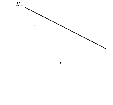 Nosotros queremos una versión proyectiva de este espacio así que tenemos que añadir un hiperplano en el infinito al espaciotiempo de Minkowski con estructura de espacio afín. Las imagenes serán en dos dimensiones así que dibujaremos una recta en el infinito pero en realidad debería ser una variedad lineal de dimensión tres.