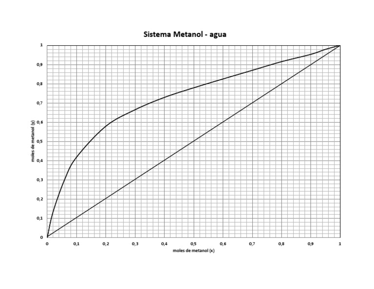 Mi pregunta es si el diagrama de una mezcla que presenta un azeótropo (como por ejemplo el Etanol-Agua), es similar a la del Metanol-Agua o tiene un punto en el que la curva y la diagonal se juntan y posteriormente se vuelven a separar?