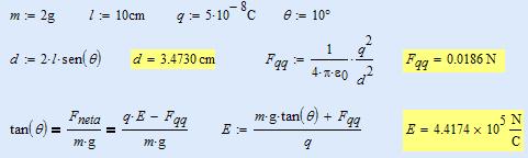 el Problema dice: 2 pequeñas esferas, cada una con una masa de 2gr se encuentran suspendidas de 2 hilos delgados de 10 cm de longitud. en la direccion de las "x" se aplica un campo electrico uniforme. las esferas tienen carga de -5xE-8 C y otra de 5xE-8 C. determine el campo electrico que permite que las esferas quede en equilibrio a un angulo de 10º con la directriz de los hilos.