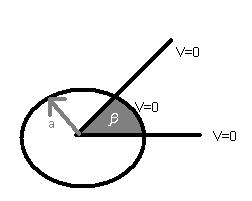 La reguion 2-dimensional, p>= a, 0<= fi<= B, esta limitada por superficies conductoras en fi=0, p=a, y fi=B a potencial cero, como se indica en la figura.