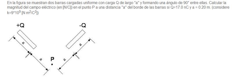 Ya este valor es el campo resultante sobre el punto "P" por parte de la barra cargada negativamente, sabemos que si en el punto "P" hay una carga negativa esta seria impulsada por el campo que genera la barra cargada negativamente en la direccion y el sentido de OX, ahora como el problema es geometricamente simetrico, y tenemos que esta otra barra se encuentra cargada positivamente, en consecuencia tenemos que el vector campo electrico se dirige en la direccion y sentido de -OY, ahora solo tenemos que hacer una simple y vulgar suma vectorial y mas facil aun porque tenemos un ángulo recto entre los dos vectores y ya sabemos sus modulos, asi que tenemos,