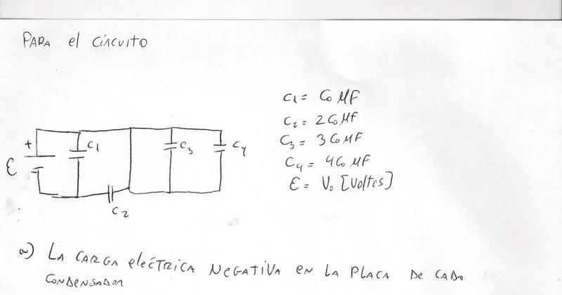 por lo que sólo me falta analizar el capacitor 1 y 2, y estos como están en paralelo, el voltaje es el mismo y luego obtengo las cargas de cada capacitor.