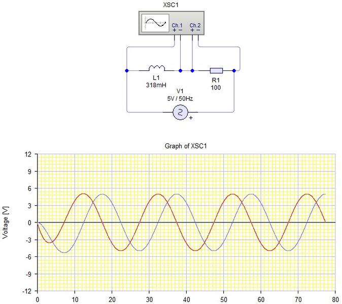 Se trata de un circuito en el que hay en serie una fuente de tension sinusoidal una bobina y una resistencia, la bobina se esta analizando en el canal 1 de un osciloscopio y la resistencia en el canal 2.