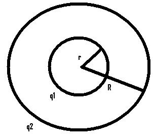 La fig representa esquematicamente dos cascarones matalicos, esfericos y concentricos de radio r = 2.10-2m y R= 4.10-2 m con cargas q1=1uC y q2=-2uC, utilizando la ley de gauss calcular en modulo, la intensidad del campo electrico a las distancias de a) 1.10-2 m; b) 3.10-2 m y c) 5.10-2m del centro de la esfera.