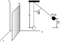 Una esfera maciza no conductora de masa m=7,5 g y con una carga +q (positiva)= 1,5 nC esta suspendido de un punto mediante una cuerda de longitud L=0,1 m. Cerca de esta carga situamos un plano no conductor y cargado homogeneamente con una densidad de carga superficial +\sigma (positiva)= 15\mu C/m^2, tal y como nos indica el dibujo.