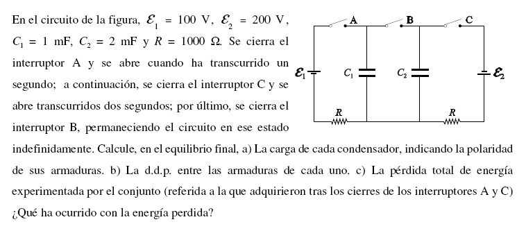 - Al cerrar el interruptor B la carga total () se redistribuye entre los dos condensadores hasta que alcancen el mismo potencial. El potencial final lo puedes calcular tomando en cuenta que la carga total se conserva: .