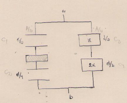 realice la figura donde podemos considerar que y estan en serie (esto es porque si suponemos que la placa superior tiene carga +Q y la inferior -Q, entonces comenzamos por arriba, +Q induce carga negativa a la siguiente placa, esta a su vez induce carga positiva a la otra, en fin la carga entre ellas es cero, esta es la explicación?). Ahora como estan en serie tenemos que entonces como la capacitancia entre placas paralelas esta dada por entonces para , para de donde la capacidad equivalente