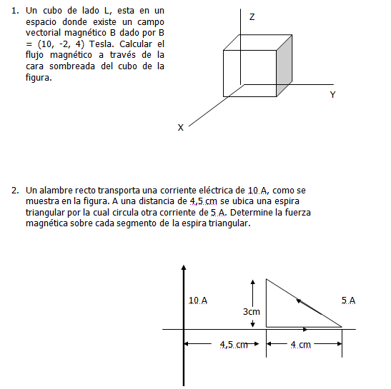 El problema 2 es mas elaborado y requiere cálculo integral para resolverlo. Debes darte cuenta que el campo que produce la corriente es perpendicular al plano de la espira y hacia adentro del plano de la figura. La fuerza sobre cada lado la obtienes integrando la fuerza sobre un elemento de corriente: