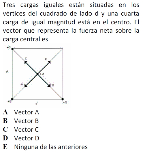 Podrías descomponer cada vector en su componente horizontal y vertical para ver cómo se distribuyen y así determinar, posteriormente la resultante del vector. Según esto, yo me inclino por la B. O más fácil, ves que los vectores de la diagonal, tienen el mismo módulo, pero sentido contrario, luego al sumarlos se anulan. Por cierto, he considerado que todas las cargas son positivas, ya que no se ve muy bien la imagen.