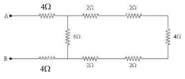 Las cuatro resistencias de 2 ohm y la de 4 ohm de la derecha están en serie. Calcula la resistencia equivalente a todas ellas, R'.