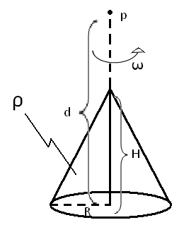 El cono de la figura se encuentra rotando a una velocidad angular ω con respecto al eje Z y posee una densidad de carga ρ. Encontrar la expresión para el campo magnético de un punto ubicado a una distancia "d" desde el centro de la base del cono, si la altura del cono es H y el radio de su base es R.