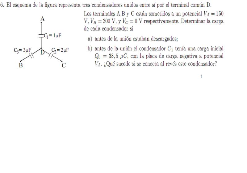 Observa que estas tres ecuaciones no son linealmente independientes. La otra ecuación necesaria para resolver el sistema proviene de la conservación de la carga en el nodo D. Para el caso a), como los condensadores están descargados la carga total en el nodo D debe ser cero: