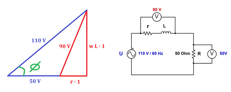 Lo estoy planteando así, aunque no entiendo muy bien si los 110 Voltios es el voltaje máximo o el voltaje en un momento dado. Pero bueno, lo he planteado como que en ese momento son 110 y que los otros son caídas de potencial.