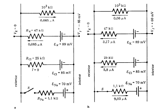 Tengo el siguiente circuito adjunto en el mensaje. Desde el FEM K se genera una diferencia de potencial de 89 mV, y desde el FEM Cl, una de 85 mV (en ambas figuras). La única diferencia entre ambas figuras es que el FEM Na está abierto para la primera, y cerrado para la segunda.