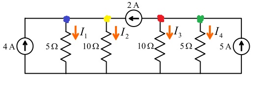 Hola a todos, he estado estudiando el análisis de nodos, y pues recién me topé con un ejercicio que no encuentro la forma de determinar las corrientes, es un circuito en paralelo con fuentes de corriente independientes, lo pongo en imagen con los nodos señalados de distintos colores: