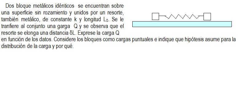 Se me ocurre que la carga Q se va a repartir en igual proporcion en ambos bloques o sea Q/2 en cada bloque. el resorte no tiene carga no?