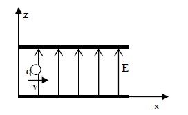 Un condensador de placas paralelas crea un campo de , en la dirección z, tal como se muestra en la