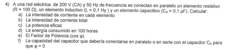 A una red eléctrica de 200 V (CA) y 50 Hz de frecuencia se conectan en paralelo un elemento resistivo (R = 100 ), un elemento inductivo (L = 0.1 H) y un elemento capacitivo ( = 0.1 ). Calcular: