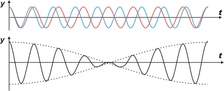 "La onda que modula la amplitud (que es la que asociamos con el batido) es la punteada. La negra de línea continua es la modulada: sus características son intermedias de las dos que se superponen, cosa que no sucede con la que modula. La frecuencia de la onda negra es la media de las frecuencias de la roja y la azul. La frecuencia de la moduladora de la amplitud es, en cambio, la semiresta."