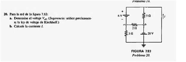 Por último, un recorrido en zigzag desde "b" hasta "b" pasando por la resistencia de 2 ohmios te permite determinar la corriente que pasa por ésta. Llamándola I5 y tomándola hacia la derecha en el diagrama, tienes: (2 ) I6 + 6 V - 20 V = 0 => I6 = 7 A (o lo haces inmediatamente, conocida la diferencia de potencial Vab, como I6 = |Vab|/(2) = 7 A hacia la derecha)