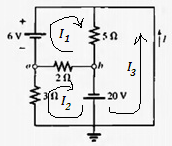 La corriente en la resistencia de 3 ohmios la puedes determinar de manera similar haciendo un reccorido desde "a" hasta "a" por todo el perimetro del diagrama: +6 V - (3 ) I2 = 0 => I2 = 2 A.
