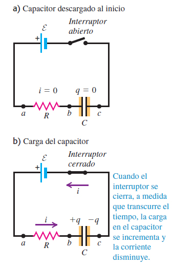 Hasta antes se han mostrado ejemplos de sólo capacitores (y se relacionaban variables: capacitancia, carga en las placas conductoras y diferencia de potencial), o sólo resistores (donde se relacionaban resistencias, corrientes y diferencias de potencial). ¿Pero para calcular la corriente a través de un capacitor?