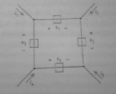 Por si no se entiende en la imagen se tiene empezando por el extremo izquierdo superior . AHi se ve una corriente que entra a esa esquina que se llama i_1, luego en el vertice de la derecha superior esa corriente es i_2 . En el extremo derecho inferior la corriente es i_3 y la del extremo ineferior izquiero es i_4.