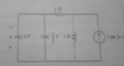 El capacitor de la izquierda vale 3 F y tiene indicada una v donde el signo + esta abajo y el signo - esta arriba, el siguiente capacitor vale 3/2 F , la resistencia vale 1 ohm y la inductancia vale 1 H, la fuente vale A