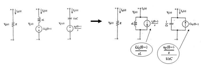 El primer paso es "redibujar" el circuito en el dominio s, para lo cual utilizo los equivalentes en el dominio s de la tercer imagen que adjunto. En la izquierda esta la forma conocida como Thevenin y en la derecha la conocida como Norton. Creo que para este ejercicio me conviene utilizar la forma de la derecha (Norton).