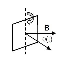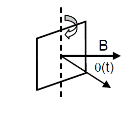 Una espira cuadrada 2,5 cm de lado, con 380 vueltas de alambre, pivoteada, gira a 1750 rpm en una región de campo magnético uniforme de 5 T.