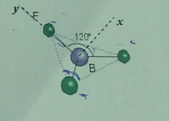La molecula (neutra) tiene los atomos de fluor sobre los vertices de un triangulo equilatero y el atomo de boro es el centro de dicho triangulo. Suponiendo que la carga de los atomos de fluor es igual a y que la longitud de los enlaces es 1 anstrong. determine:
