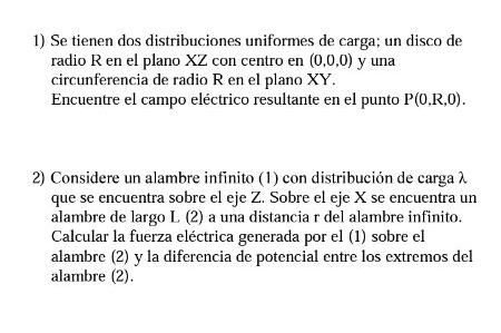 En el caso del primer ejercicio, nota que el problema no está completamente determinado si no especificas el centro del anillo. Yo supongo que el anillo tiene centro en (0,R,0) para que el problema tenga una solución sencilla. Imagino que el enunciado viene acompañado de una figura donde se verá eso con claridad. Tampoco se especifican las cargas del disco ni del anillo. No hay problema, se trabaja con valores genéricos. Se podría decir que el disco tiene densidad y que el anillo tiene carga y proceder en consecuencia.