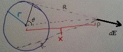 Yo conozco el típico ejercicio en que el punto p esta a una cierta distancia del eje del anillo, pero por encima de este, ese caso es fácil ya que la distancia del punto "p" es la misma a todos los puntos del anillo, en este caso todas las distancias del punto "p" a los puntos del anillo varían, sin embargo creo que el campo resultante también va en el sentido del eje donde se encuentra el punto p, lo que me complica es el tema de las distancias, por lo que cualquier ayuda me seria util.