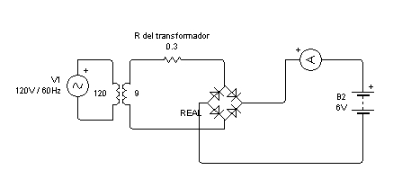 Saludos, en el circuito mostrado más abajo se presenta un rectificador de onda completa para cargar una batería de 6V. Asumir diodos reales y que Ri en el secundario del transformador es de 0.3ohm. Agradezco que alguien me ayude a conseguir el valor y la gráfica de i(t) (la corriente por la batería), así como determinar la lectura del amperímetro (Idc) y hallar el tiempo en que se carga la batería si su carga máxima es de 250A-h.