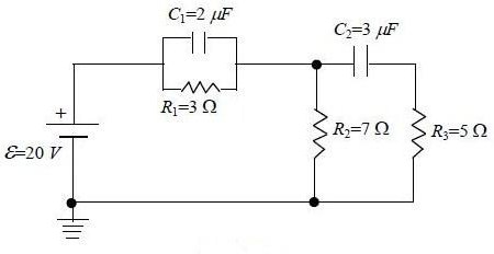 Este ejercicio me pide que halle la carga de cada condensador, la diferencia de potencial entre sus extremos y la energía almacenada en cada condensador suponiendo que el circuito ha alcanzado el estado estacionario.