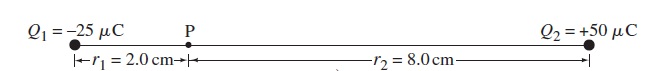 dos cargas puntuales a lo largo de una linea separadas por una distancia de 10 [cm], la carga y la carga determine la magnitud y dirección del campo eléctrico en un punto P entre las dos cargas que se ubica a 2 [cm] de la carga negativa.