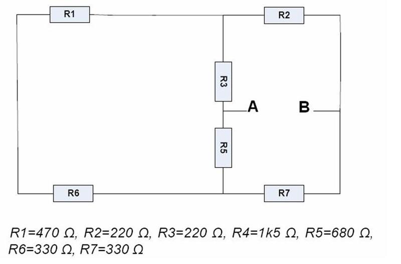 Estoy intentando calcular la resistencia equivalente de este circuito entre los extremos A y B pero no veo cómo puedo agrupar las resitencias para calcular la resistencia equivalente. Gracias por adelantado.