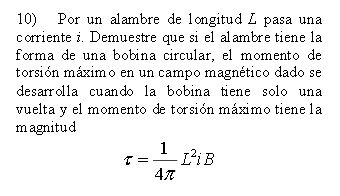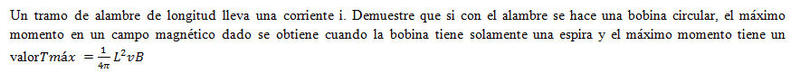 Un tramo de alambre de longitud lleva una corriente i. Demuestre que si con el alambre se hace una bobina circular, el máximo momento en un campo magnético dado se obtiene cuando la bobina tiene solamente una espira y el máximo momento tiene un valor TMÁX = 1/4PI L^2vB
