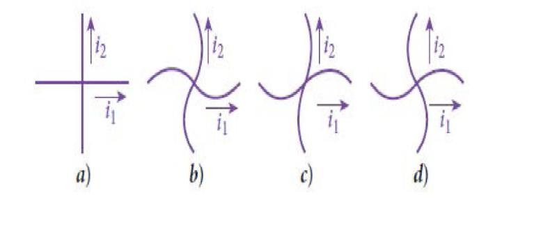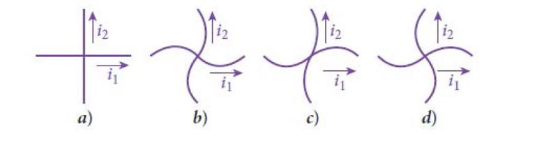 -Dos alambres que están aislados se cruzan con un ángulo de 90º. Por los dos circulan corrientes similares en dirección x positiva e y positiva. ¿Cuál de la imágenes es la que mejor representa la configuración de los alambres?