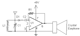 si ves la señal de la "captada" por la antena es aplicada al circuito tanque, y la señal deseada caerá en L1 y C1 y por lo tanto en la entrada inversora (-) del amplificador. Las frecuencias indeseadas no caen en dicho componentes, "pasan de largo"(en realidad se amplican a la impedancia interna de la antena que es lo que te comentaba antes). A su vez el circuito tiene un diodo por lo tanto es un desmodulador AM. Y como hay un capacitor variable puedes controlar la frecuencia de resonancia en un cierto margen.