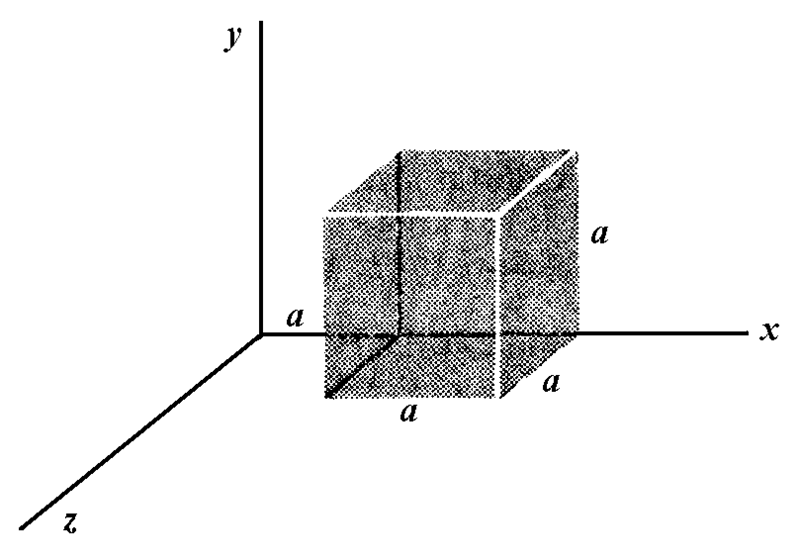 Las componentes del campo eléctrico en la figura son Ex = bx½, Ey = Ez = 0, donde b = 8830 N/C m½. Calcule (a) el flujo Ф, a través del cubo y (b) la carga dentro del cubo. Suponga que a = 13.0 cm. El cubo está ubicado a una distancia a del plano yz.