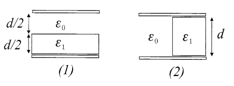En este caso los dos condensadores son idénticos en sus dimensiones pero uno no tiene dieléctrico (lo llamo ) y el otro si (). Se cumple que