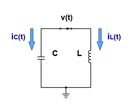 En el circuito que se ilustra en la figura, el interruptor/conmutador se encuentra inicialmente en la posición A, de forma que el condensador de capacidad C se carga al potencial de la fuente V0. Una vez que el condensador está completamente cargado se pasa el conmutador a la posición B estableciéndose una corriente a través de la inductancia L.