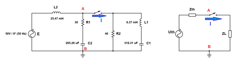 Vuelvo a pedir ayuda por algo parecido al caso anterior, otra equivalencia de Thevenin ¿Me equivoco al afirmar que c2 y r1 no actúan en absoluto para calcular el equivalente y la potencia dentro de a y b?