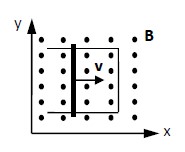 Una varilla metálica de 1 m de longitud, se desplaza con una velocidad constante v= 2 i m/s, sobre un alambre metálico doblado en forma de U paralelo al plano xy,. En la región hay definido un campo magnético B=0.4 k (T) perpendicular al plano xy, según se indica en la figura adjunta. ¿Cuánto vale la FEM inducida en el circuito?