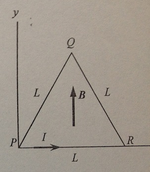 La espira en forma de triángulo equilátero de lado L, conduce una corriente I en el sentido que se indica. La espira se encuentra en un campo magnético uniforme de módulo B orientado en la dirección del eje +y. Determine la fuerza (módulo y dirección) que el campo magnético ejerce: